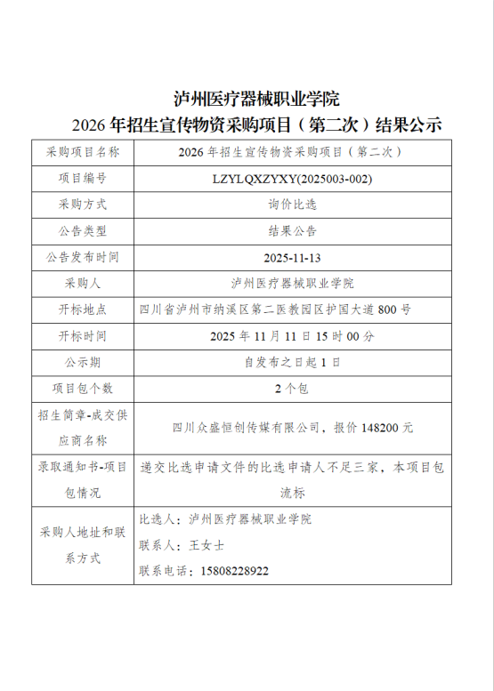 >>泸州医疗器械职业学院 2026年招生宣传物资采购项目(第二次)结果公示