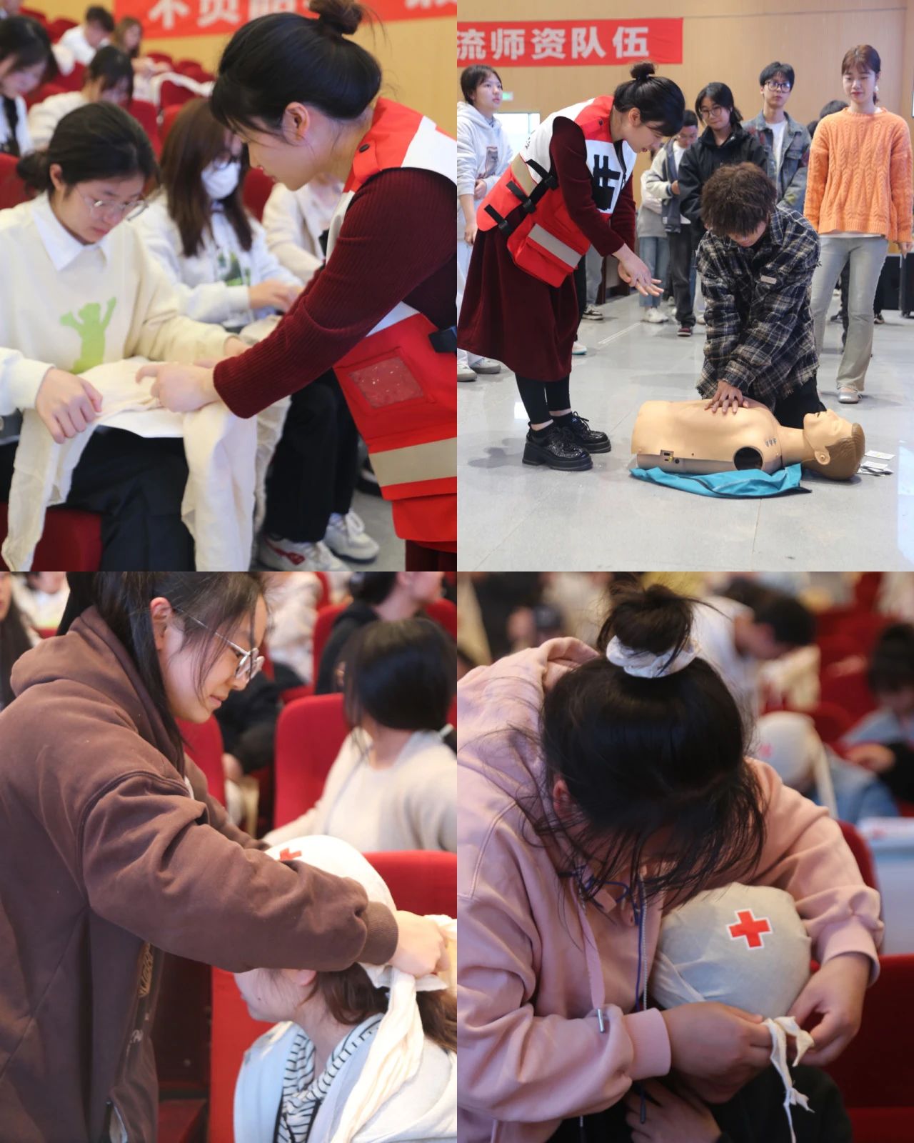 了解与学习现场应急救护知识,可以让学生们提高应急救护技能、掌握应急救护技巧。培训老师围绕心肺复苏、AED操作、骨折处理、伤口包扎等方面,进行详细讲解,使同学们受益匪浅,现场学习氛围非常浓厚。