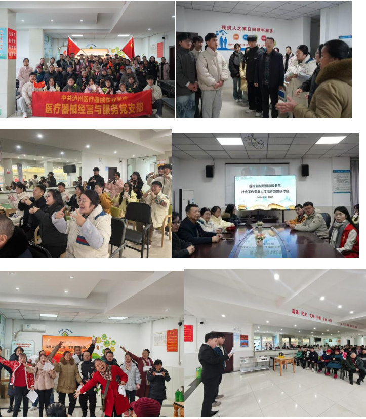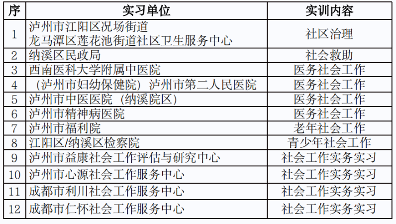 在实训基地建设上,与西南医投康乐家园、西南医科大学附属中医院、泸州市社会福利院、泸州市中医医院(城南院区)、泸州市纳溪区民政部、泸州春江养老服务有限公司、泸州市蓝田街道残疾人之家等多家单位建立了实习合作关系,与本校社会工作特色专业方向(医务社会工作、老年社会工作、社区社会工作、儿童青少年社会工作等)深度契合。实训基地化为专业教学的 “第二课堂”,帮助学生置身真实工作场景,将课堂所学理论灵活运用于实践,在老年关怀、医疗救助、弱势群体帮扶等领域反复锤炼专业技能,真正实现理论知识与社工实践的无缝对接,全方位提升专业素养。