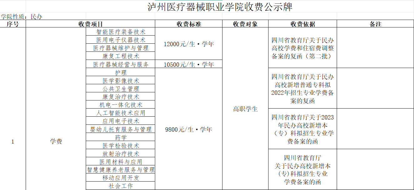 >>泸州医疗器械职业学院收费公示牌