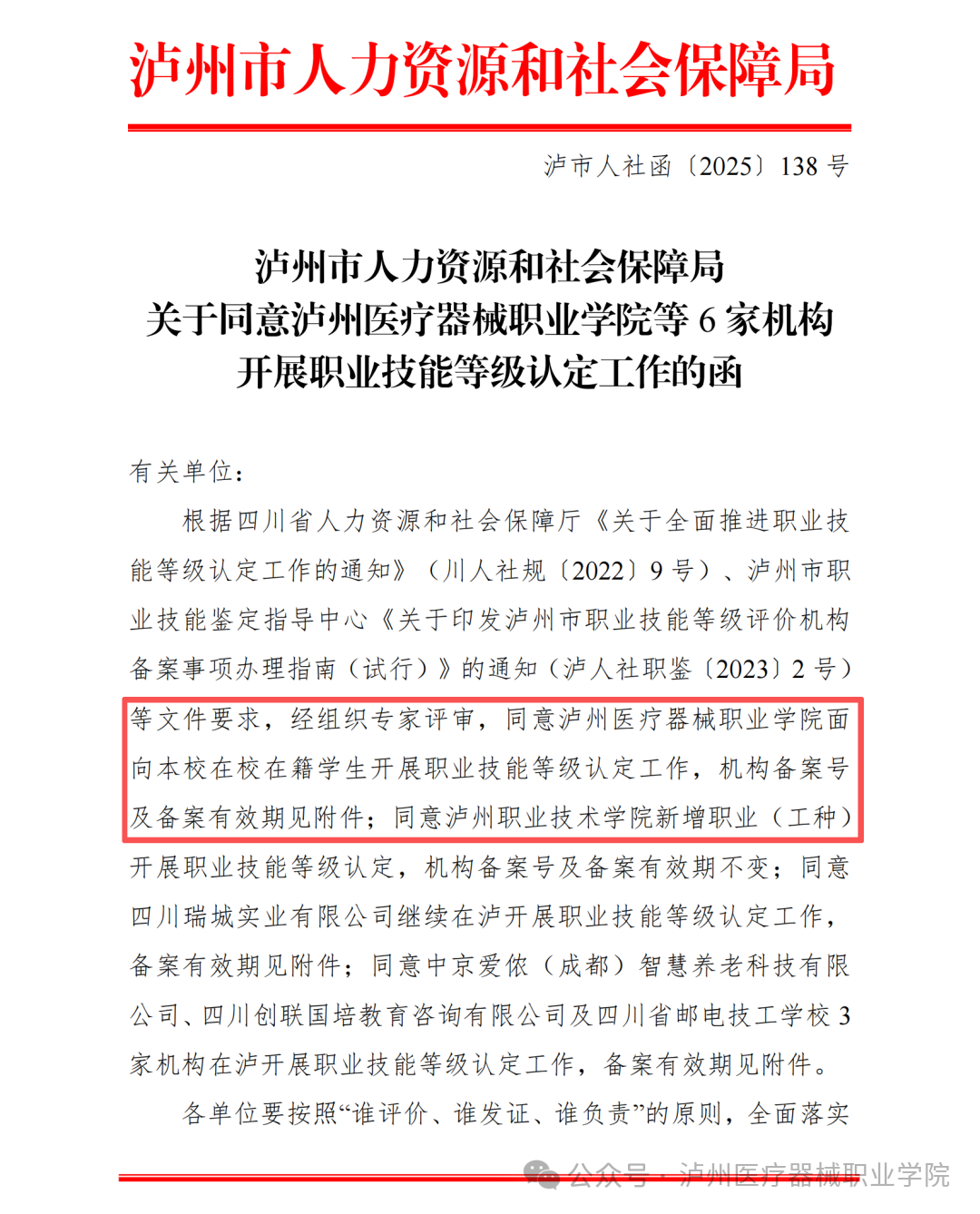 近日,经泸州市人力资源和社会保障局正式批复(泸市人社函〔2025〕138号),泸州医疗器械职业学院成功获批成为职业技能等级认定机构,具备面向本校在籍学生开展职业技能等级认定的资质。此举标志着学校在深化产教融合、强化实践教学、服务学生成长与行业发展方面取得了重要突破。